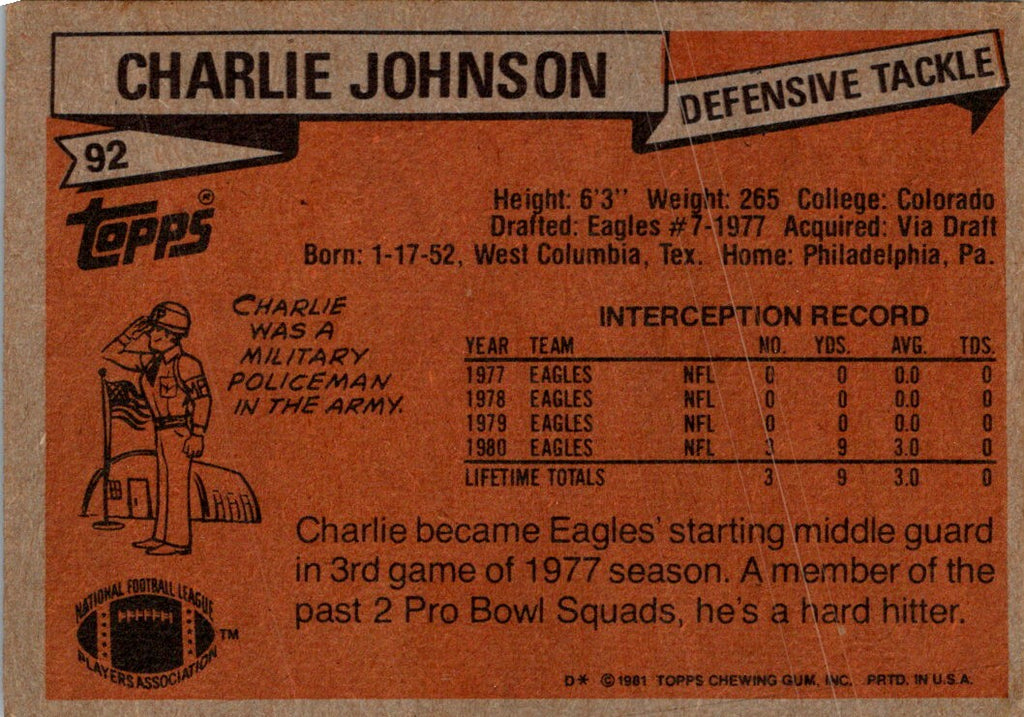 This 1981 Topps Charlie Johnson #92Philadelphia Eagles card is a great piece of memorabilia for any NFL fan. Featuring an action shot of the star Eagles running back, this card is a must-have for any collector. The back of the card features Johnson's stats, including rushing yards, touchdowns, and more. A great addition to any collection, this card is sure to be a conversation starter.