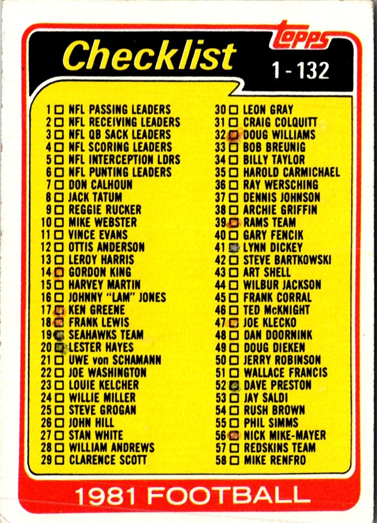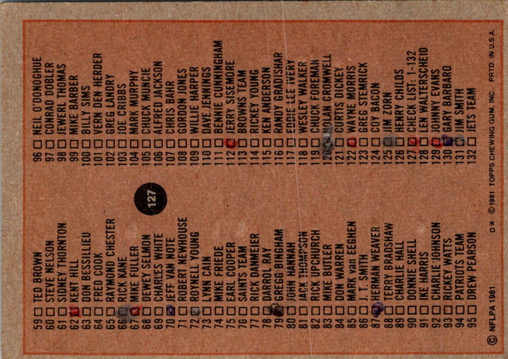 This 1981 Topps Checklist #127 is a must-have for any serious sports card collector. Featuring classic photos of some of the biggest names in the history of the game, this card is the perfect addition to your growing collection. It's in excellent condition, with crisp colors that stand out on the glossy card stock. This card is certain to be a talking point among your fellow card collectors, and will make a great addition to any collection. Get your hands on this 1981 Topps Checklist #127 today!