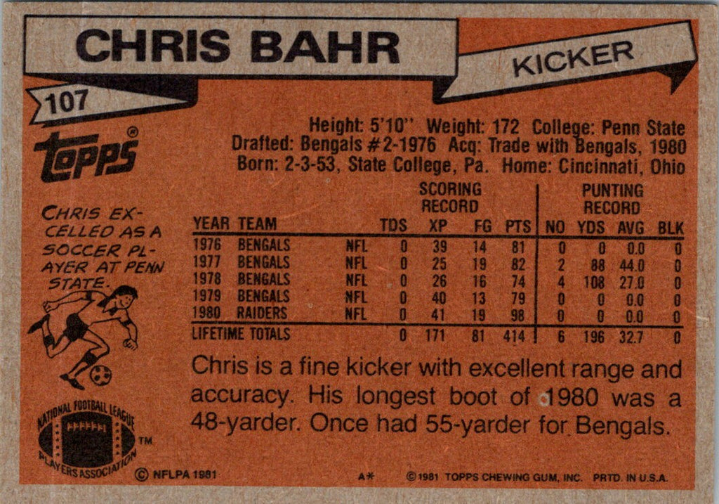 This 1981 Topps Chris Bahr #107 Oakland Raiders card is a must-have for any Raiders fan! The card features the classic Raiders logo and colors, and a crisp action shot of the former kicker. Bahr was a vital part of the Raiders' success in the late 1970s and early 1980s. The card is an excellent way to commemorate one of the Raiders' greatest players and a reminder of the team's legendary history. Add this card to your collection today!