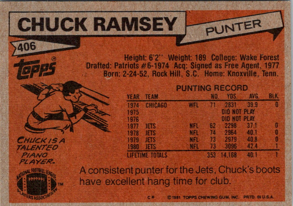 This 1981 Topps Chuck Ramsey #406 New York Jets card is in great condition and a great find for any Jets fan. It features a dynamic image of the legendary quarterback in his signature throwing pose. The card also features all the important stats from his career with the Jets, making it an excellent addition to any collection. Collectors will love the vibrant colors and sharp corners on this card, the perfect way to show your passion for the New York Jets. Add this card to your collection today and showcase your fandom!