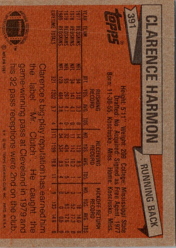 This 1981 Topps Clarence Harmon #391 Washington Redskins card is a must-have for football fans and card collectors alike! Featuring a stunning head-and-shoulders image of Harmon on the front, this glossy card celebrates one of the most iconic players in the National Football League. The back of the card features an action shot of Harmon in full stride along with his career stats and biography. A great addition to any collection, this card is sure to please any fan of the Washington Redskins!