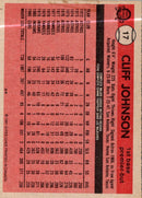 This 1981 Topps Cliff Johnson #17 Chicago Cubs card is an essential piece for any Cubs fan or collector. It features a vibrant, full-color image of Johnson, along with a full stats list and bio from the 1981 season. With its classic Topps design, this card is a timeless piece of baseball memorabilia that will look great in any collection. Add this timeless piece of Cubs history to your collection today!