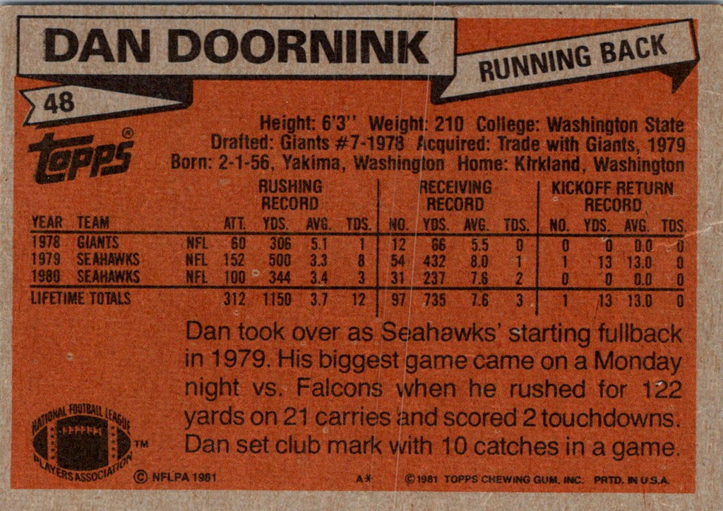 This 1981 Topps Dan Doornink card #48 is a great addition to any Seattle Seahawks fan's collection. Doornink was a fullback for the Seahawks from 1979-1983 and was known for his power and agility. His card showcases him in action, with a sharp focus on the details of his uniform and the intensity of the game. This card is an excellent way to show your support for the franchise and is sure to make a great addition to any collection.