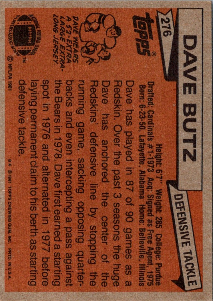 This 1981 Topps Dave Butz card #276 is a must-have for any Washington Redskins fan. Butz was a Hall of Fame defensive tackle and an 8-time Pro-Bowler. He was a cornerstone of the Redskins' defense during the 1980s, helping anchor a team that won Super Bowl XVII. This card features an action shot of Butz in his iconic Redskins uniform along with an informative back. It's the perfect addition to any Redskins memorabilia collection.
