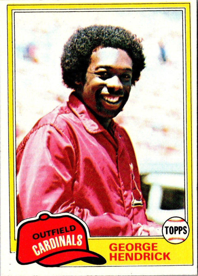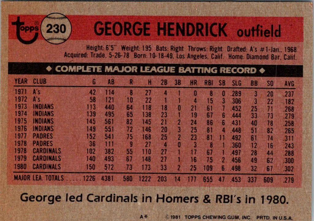 This 1981 Topps George Hendrick #230 St. Louis Cardinals card is a must-have for any baseball fan. Hendrick is pictured in a vintage Cardinals uniform, ready to swing for the fences. The card is in near-mint condition with sharp corners and no noticeable wear. The back of the card contains a statistics and biography, providing an in-depth look at the career of this legendary outfielder. Add this card to your collection today and honor one of the greatest Cardinals of all time.