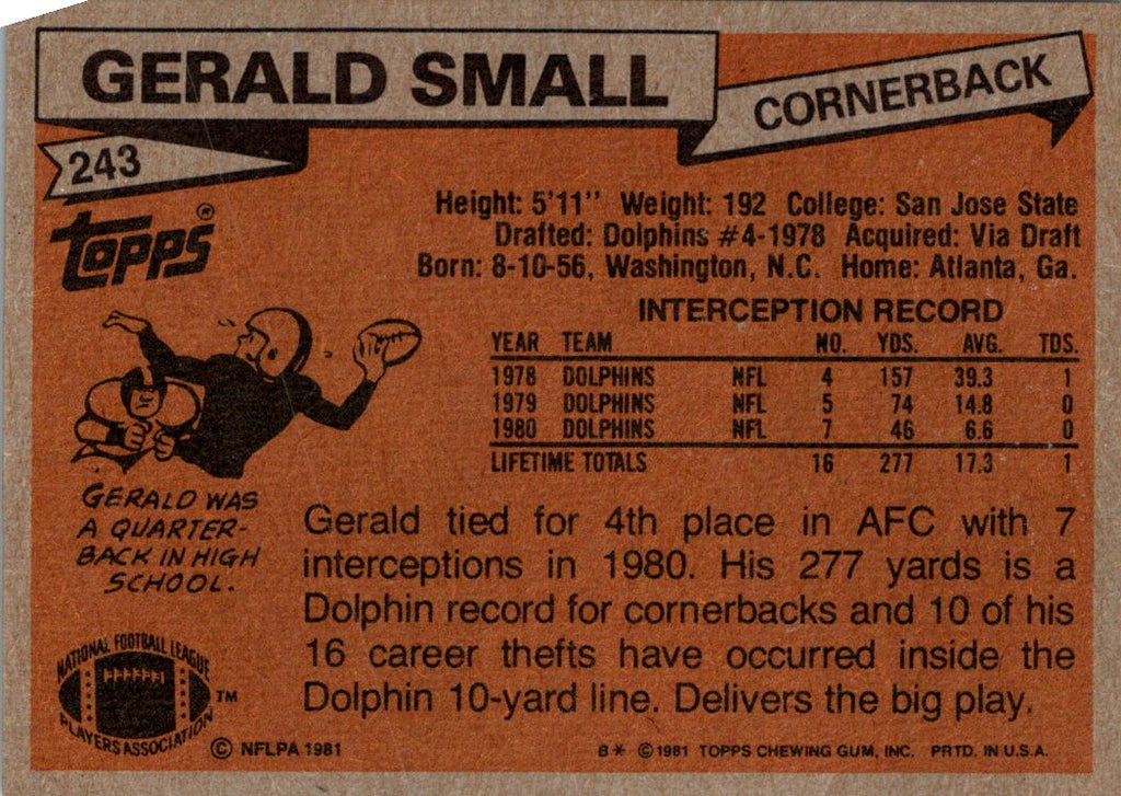 This 1981 Topps Gerald Small #243 Miami Dolphins card captures the essence of Small's rookie season. Showcasing a glossy image of Small, this card will bring back memories of the 1981 NFL season. Small was a key contributor to the Dolphins' success during his rookie season and this card is a great way to remember his performance. This card is a must-have for any Miami Dolphins fan or card collector. Add it to your collection today!