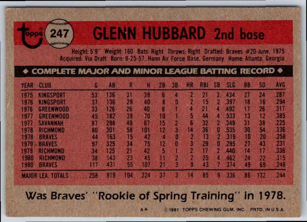 Introducing the 1981 Topps Glenn Hubbard #247 Atlanta Braves! This iconic card features a stunning black-and-white action shot of Hubbard in full swing, wearing his signature Braves uniform. This card is perfect for any Braves fan looking to add to their collection, with the potential to increase in value over time. An absolute must-have for any baseball card collector. Get your hands on this classic today!