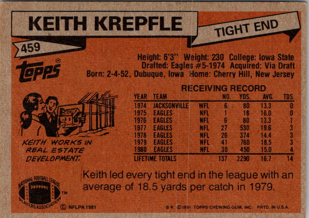 This 1981 Topps Keith Krepfle #459 Philadelphia Eagles card is a must-have addition to any Eagles fan's collection. Featuring Krepfle in his classic blue and white uniform, this card captures the excitement of the 1981 season. With bright colors and detailed action shots, this card is a perfect reminder of what made Krepfle one of the most dominant tight ends of his era. Add this classic card to your collection and relive Eagles history.