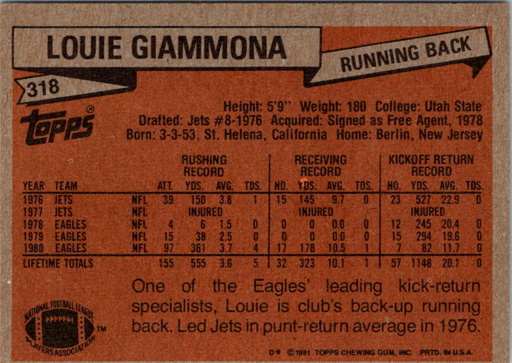 This 1981 Topps Louie Giammona #318 Philadelphia Eagles card is a must-have for any fan of the Eagles and would make an excellent addition to any collection. Giammona, a fullback for the Eagles, was an integral part of the team in the late 70s and early 80s. He was known for his gritty style of play and his ability to break tackles and gain yards. This card captures the essence of Giammona in his Eagles uniform, bringing back memories of his playing days. It would make a great addition to any Eagles fan's collection.