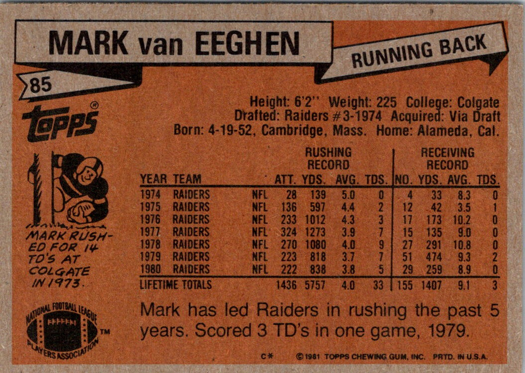 Description: 1981 Topps Mark Van Eeghen #85