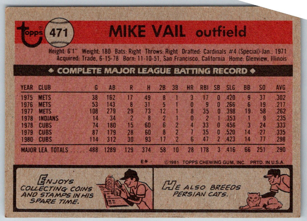 Mike Vail was a fan favorite during his time with the Chicago Cubs. He played for the team from 1976 to 1979 and was part of their 1978 division championship. This card of him from the 1981 Topps series is a must-have for any Cubs fan. It features a classic portrait of Vail in his Cubs uniform, with a light blue sky and the Cubs logo in the background. The card also includes his stats from the 1980 season, where he had a .284 batting average and 4 home runs. This card is perfect for any collection, and a great way to remember the glory days of Mike Vail and the Chicago Cubs.
