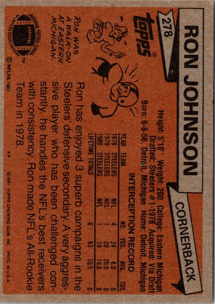 This 1981 Topps Ron Johnson #278 card is a must-have item for any Pittsburgh Steelers fan. It features a fantastic image of Johnson in his classic Steelers uniform, ready to make a big play. The card also includes his stats, team logo, a detailed biography and biographical information. This card is the perfect way to commemorate one of the most iconic players in Steelers history. Add this card to your collection today and show your Steelers pride!