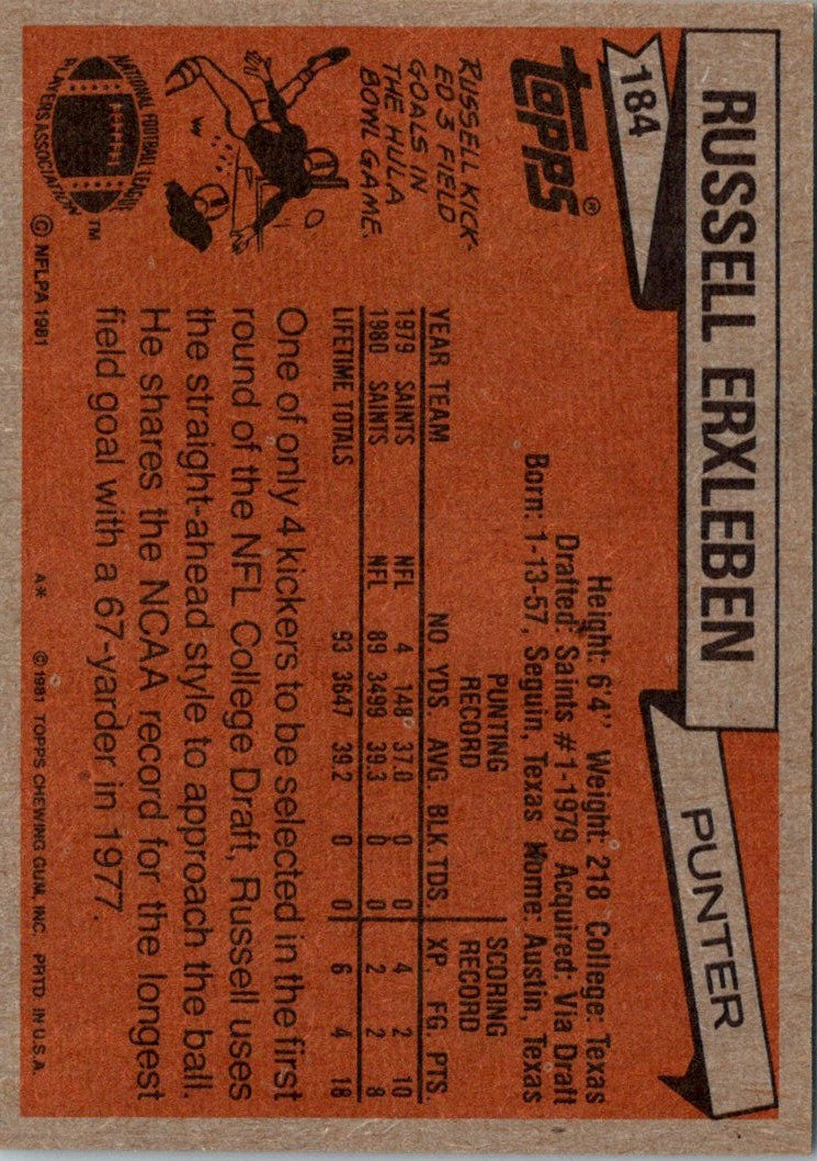 This 1981 Topps Russell Erxleben #184 card from the New Orleans Saints is a great addition to any football fan's collection! Featuring a full-color image of the legendary punter, this card is sure to stand out in any collection. Erxleben was a three-time Pro Bowl selection in his career and his 1981 season was one of his best. This card captures the moment of his finest season and is a great piece of Saints history. Add this card to your collection and you won't be disappointed!