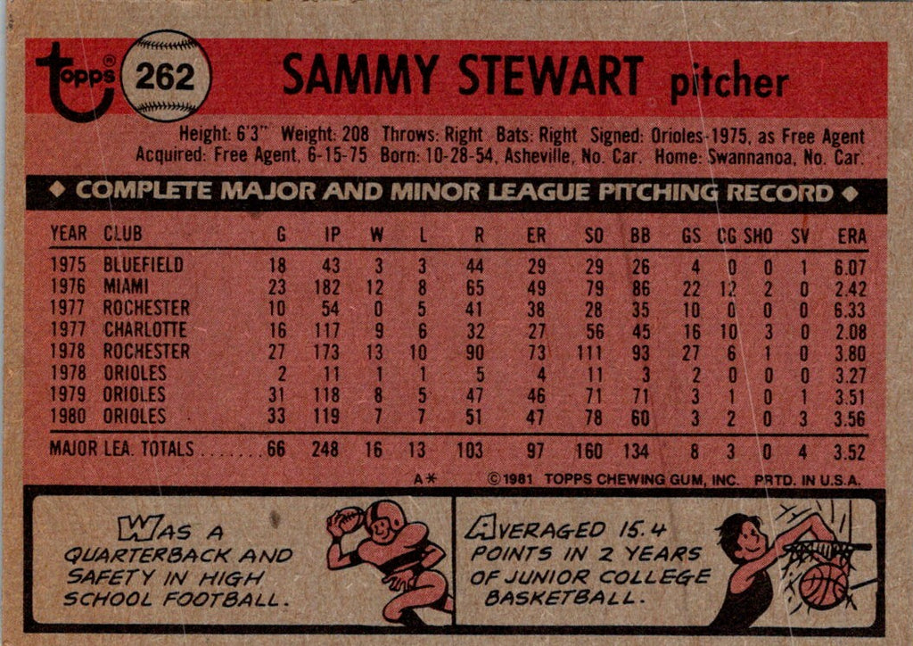 This 1981 Topps Sammy Stewart #262 Baltimore Orioles card features a full-color image of the Orioles pitcher in action at the mound. It's a great addition to any baseball card collection and a must-have for Orioles fans! The back of the card includes biographical information and his career stats. This card is in near mint condition and is a great way to honor a true Orioles legend! Get your hands on this piece of history today!