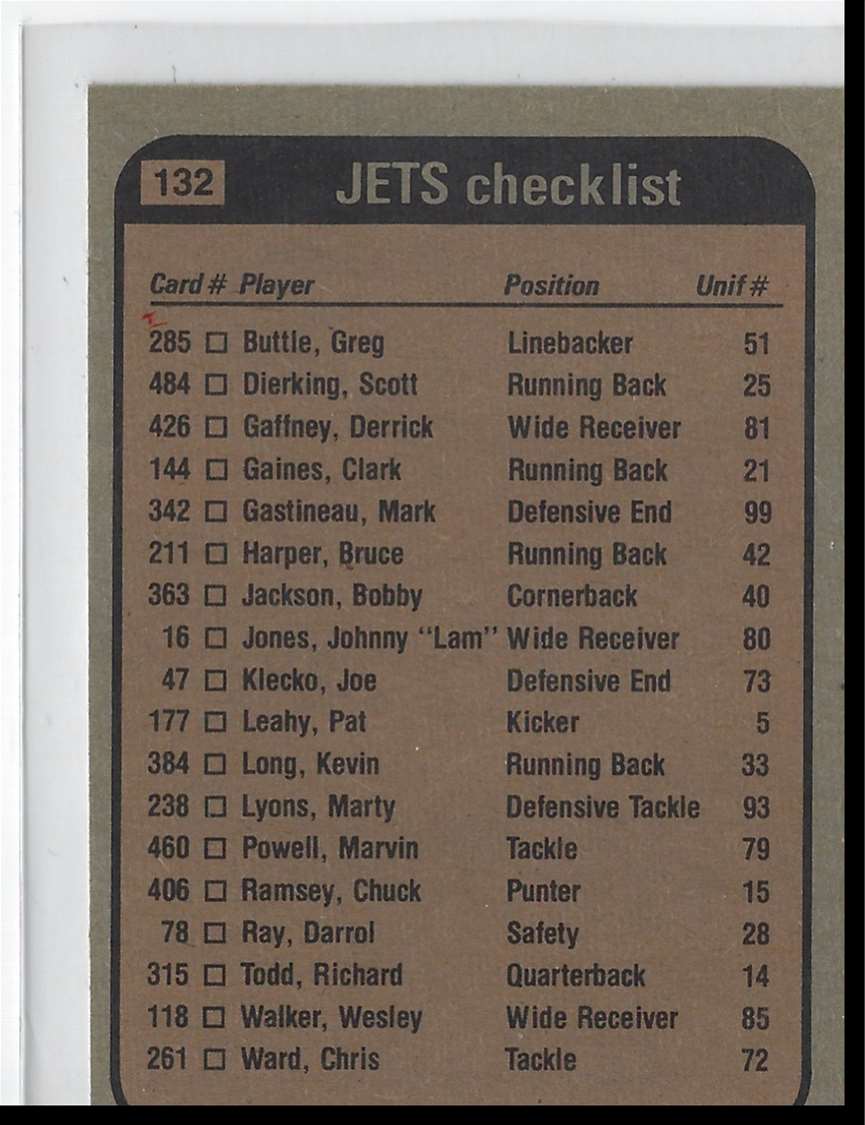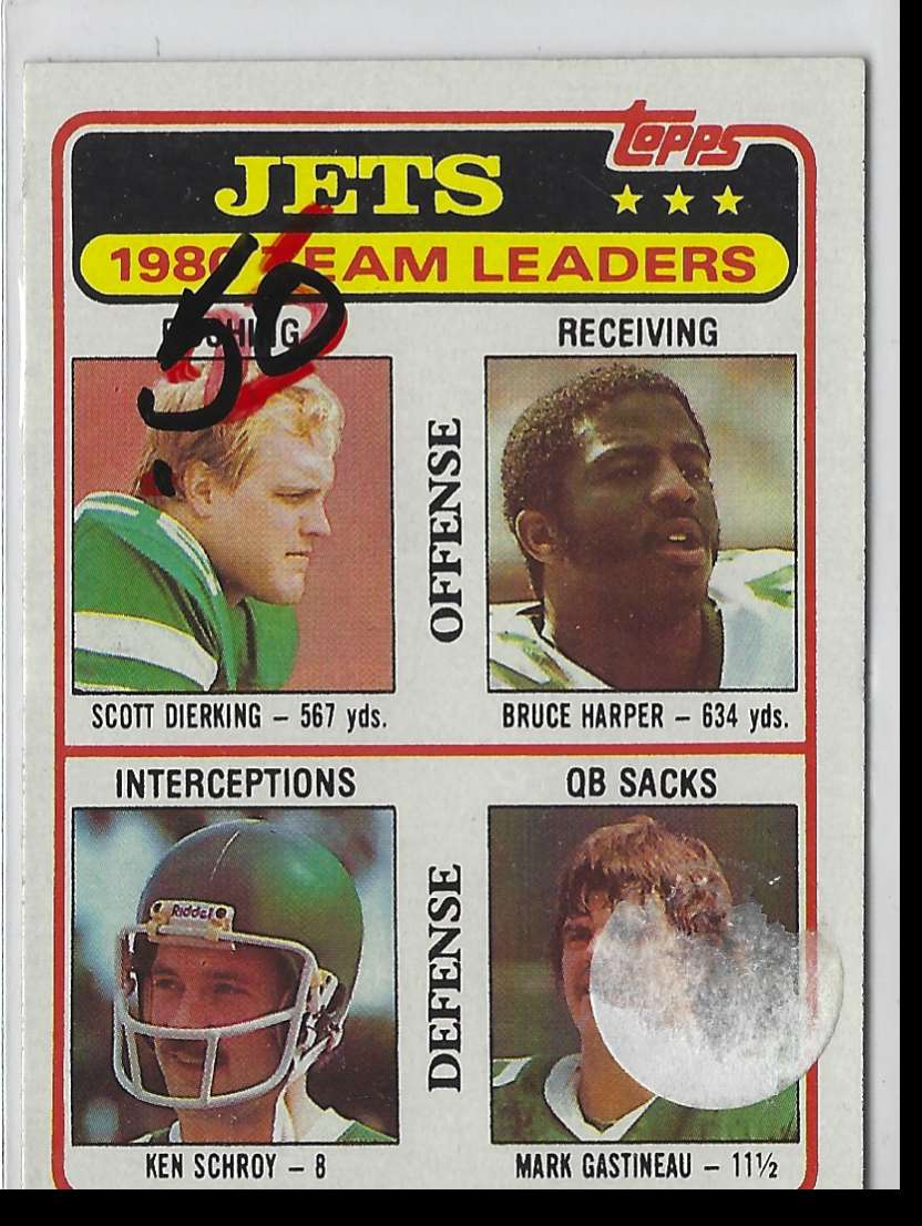 This 1981 Topps #132 New York Jets card features four of the team's best players: Scott Dierking, Bruce Harper, Ken Schroy, and Mark Gastineau. This card is the perfect collectible for any Jets fan and a must-have for any serious sports card collector. The card is in near-mint condition and features full-color action shots of the four players. This card is a great piece of football history and is sure to become a prized part of any collection. Add this card to your collection and show your Jets pride today!