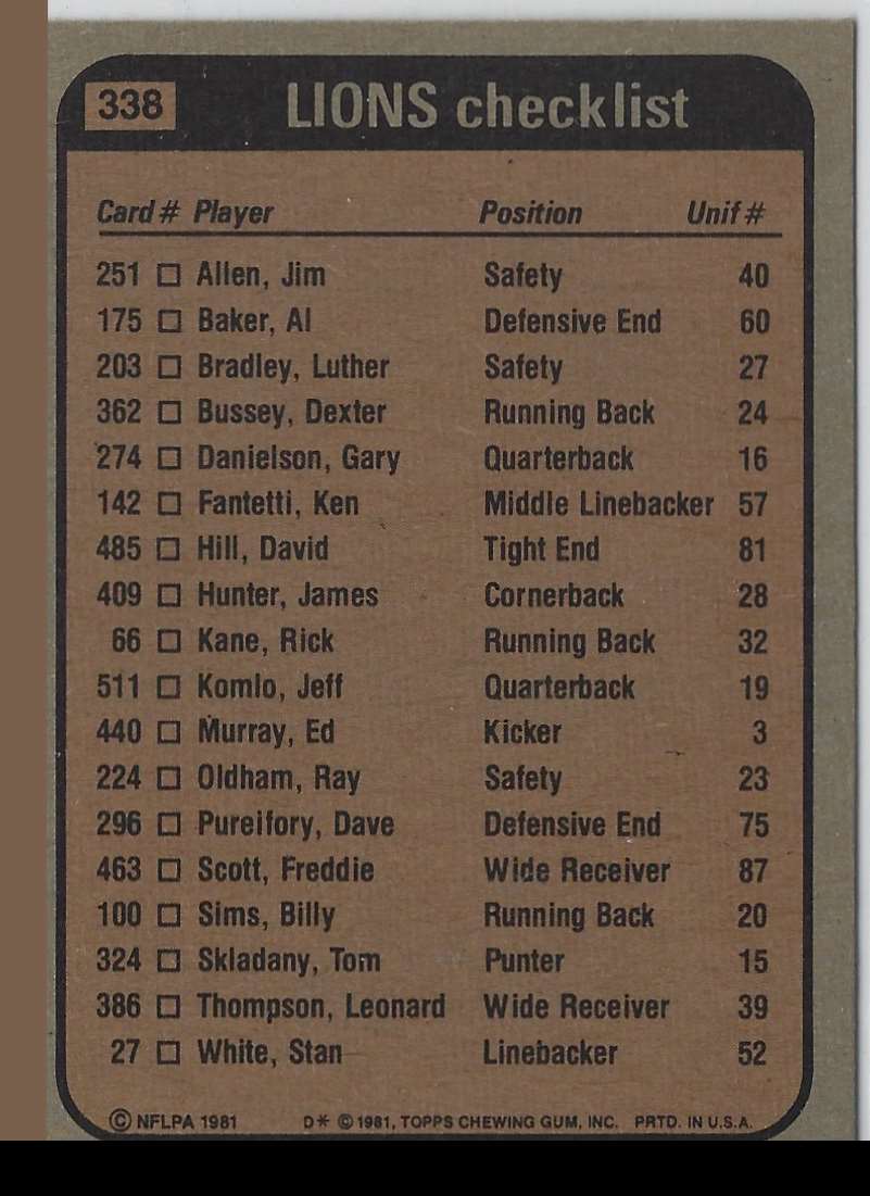 This 1981 Topps Team Checklist features five Detroit Lions greats - Billy Sims, Freddie Scott, Jim Allen, James Hunter, and Al Baker! Each card showcases an action shot of each player, with their full name and team logo. This set is a must-have item for any Lions fan, and a great addition to any football card collection. Get your hands on this classic piece of sports memorabilia today!