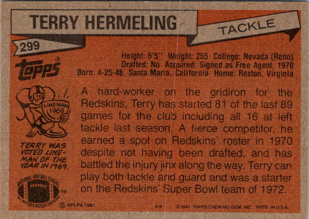 This 1981 Topps Terry Hermeling #299 Washington Redskins card features a timeless image of the tight end in action. The card includes all the details of a classic Topps card, with vibrant colors, and classic design and lettering. The card is in excellent condition, and is a great addition to any Washington Redskins fan's collection. Add this iconic piece of Terry Hermeling memorabilia to your collection today and make it part of your sports collection for years to come.