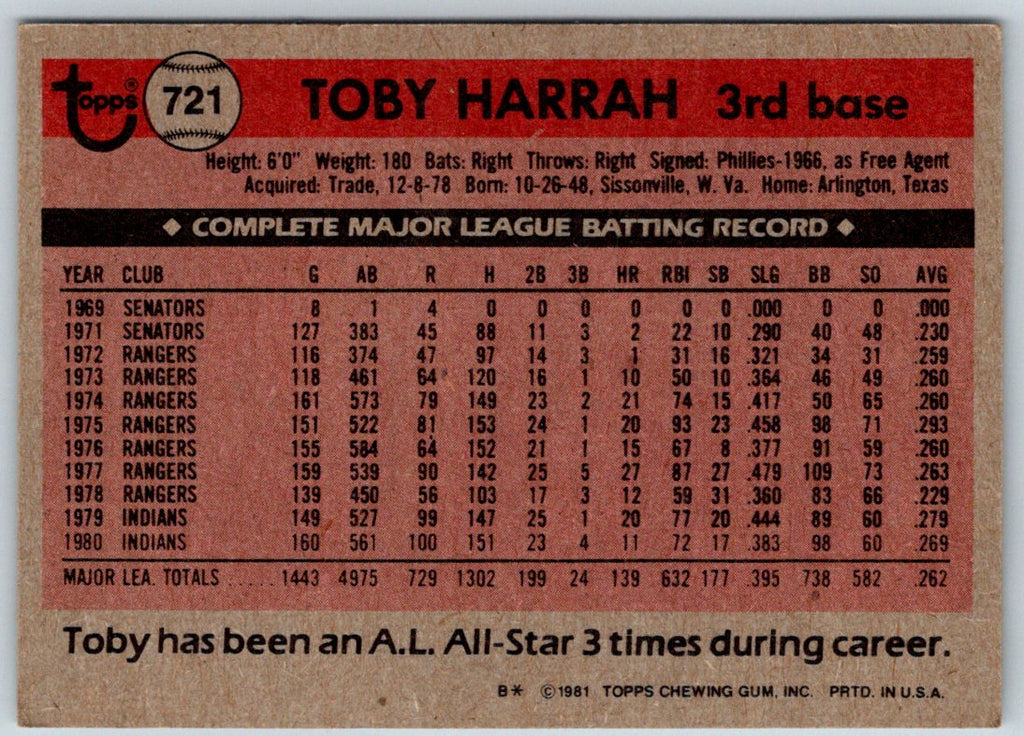 1981 Topps Toby Harrah #721