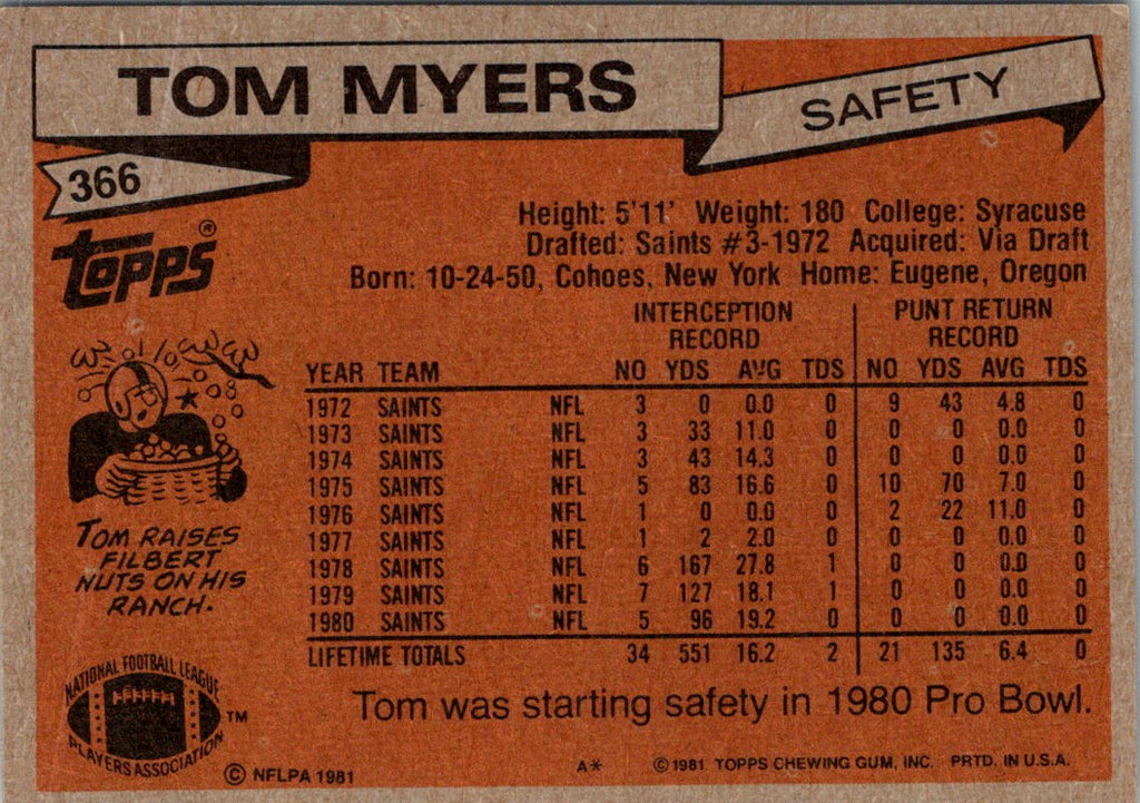 This 1981 Topps Tom Myers #366 New Orleans Saints card is a must-have for any football fan! Featuring a classic photo of the legendary Saints defensive back, this card is sure to be a great addition to your collection. With vibrant colors and sharp details, you can almost feel the intensity on the field! This card is in excellent condition and is sure to be a great conversation starter! Add this card to your collection today!