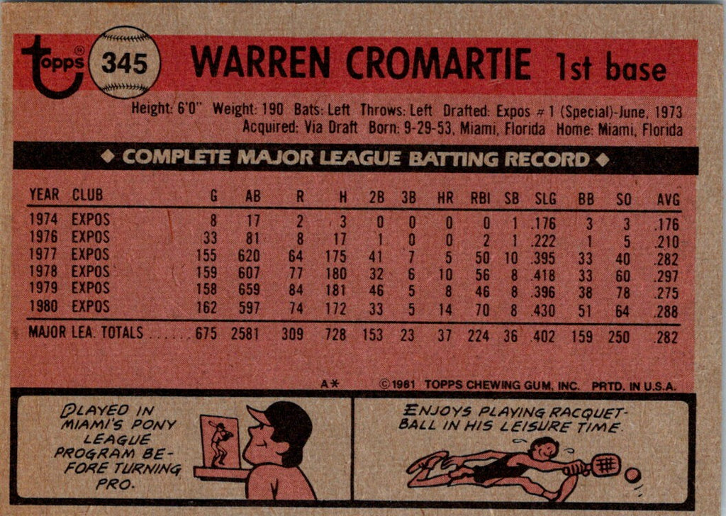 This is your chance to own a piece of MLB history with 1981 Topps Warren Cromartie #345 Montreal Expos card! This card features a classic image of Warren Cromartie in his Expos uniform, making it a must-have item for any Montreal Expos fan. The card is in near mint condition and is sure to bring a smile to your face every time you see it. With its vibrant colors and crisp details, this card is sure to become a timeless classic in your collection! Add this card to your collection today and relive the glory of the Montreal Expos!