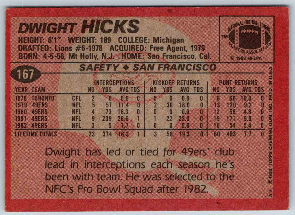This 1983 Topps Dwight Hicks card #167 is a must-have for any serious collector! Hicks was a 4-time Pro Bowl selection and an integral part of the San Francisco 49ers' success in the 1980s. This card features an action shot of Hicks making a tackle on the field, with a crisp and vibrant background. His name and team logo are prominently featured on the front, with his career stats and bio on the back. Don't miss out on your chance to add this great piece of history to your collection!