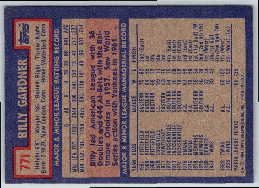 Make sure you add 1984 Topps Billy Gardner #771 to your Minnesota Twins collection today! This card features a clear, vibrant photograph of Gardner in his Twins uniform, and is sure to be a great addition to any fan's collection. The card is printed on durable cardboard, so it will last for years to come. All of the stats and game information are clearly displayed, giving you the perfect memento of Gardner's time with the Twins. Don't miss out on this fantastic card; add it to your collection now!