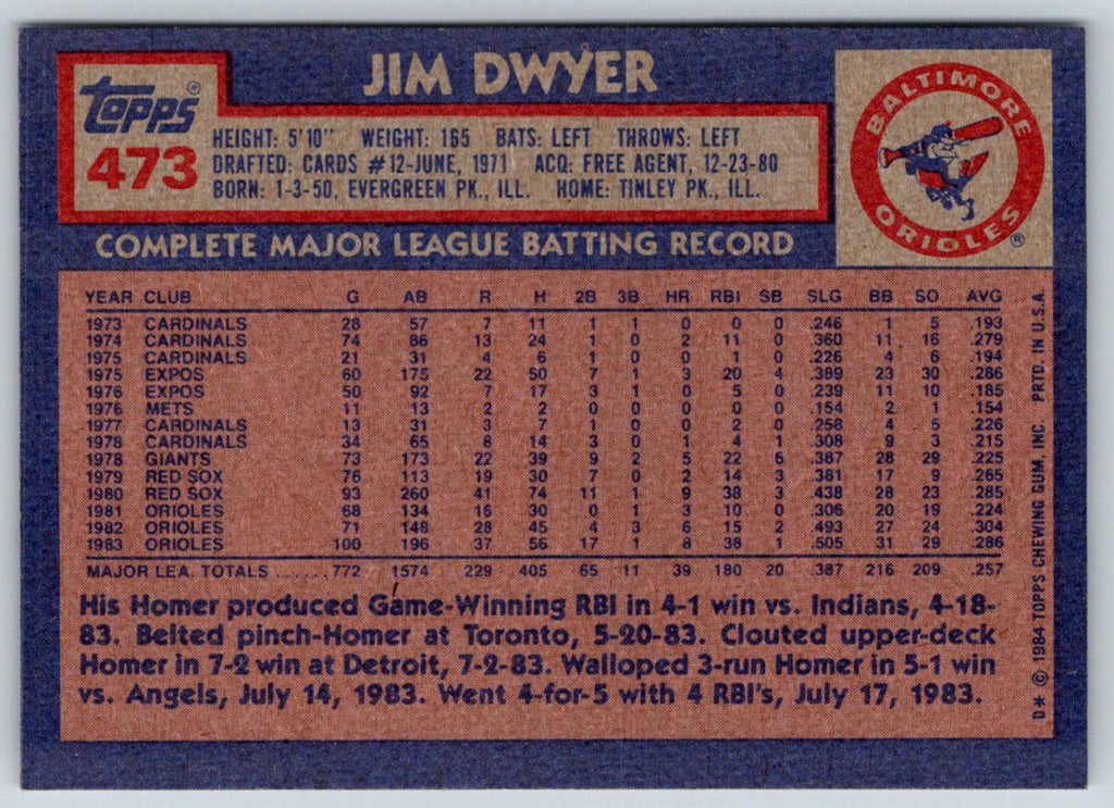 This 1984 Topps Jim Dwyer #473 Baltimore Orioles card shows one of the team's most iconic players during one of the most successful eras in its history. Featuring a full-color action shot of Dwyer in his classic batting stance, this card captures the energy and excitement of the Orioles' lineup. With its vibrant colors and durable construction, this card is perfect for any Orioles fan's collection. Add this piece of Baltimore baseball history to your collection today!