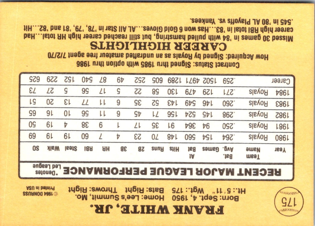 Description: 1985 Donruss Frank White #175