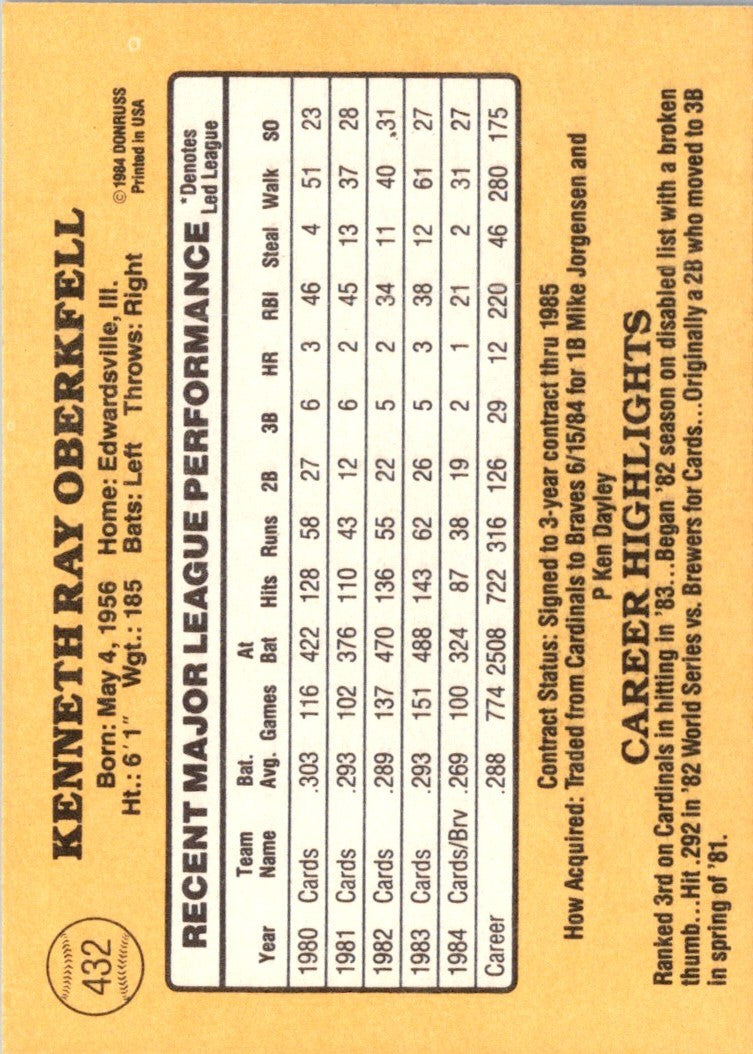 This 1985 Donruss Ken Oberkfell #432 Atlanta Braves card is a great addition to any baseball card collection. Featuring a glossy image of the veteran infielder in his Braves uniform, it's a must-have for any Braves fan. Oberkfell played for the Braves from 1984 to 1987 and was an important part of the team's success during that time period. It's a great way to honor the memory of this former Braves star. Add this classic card to your collection today!