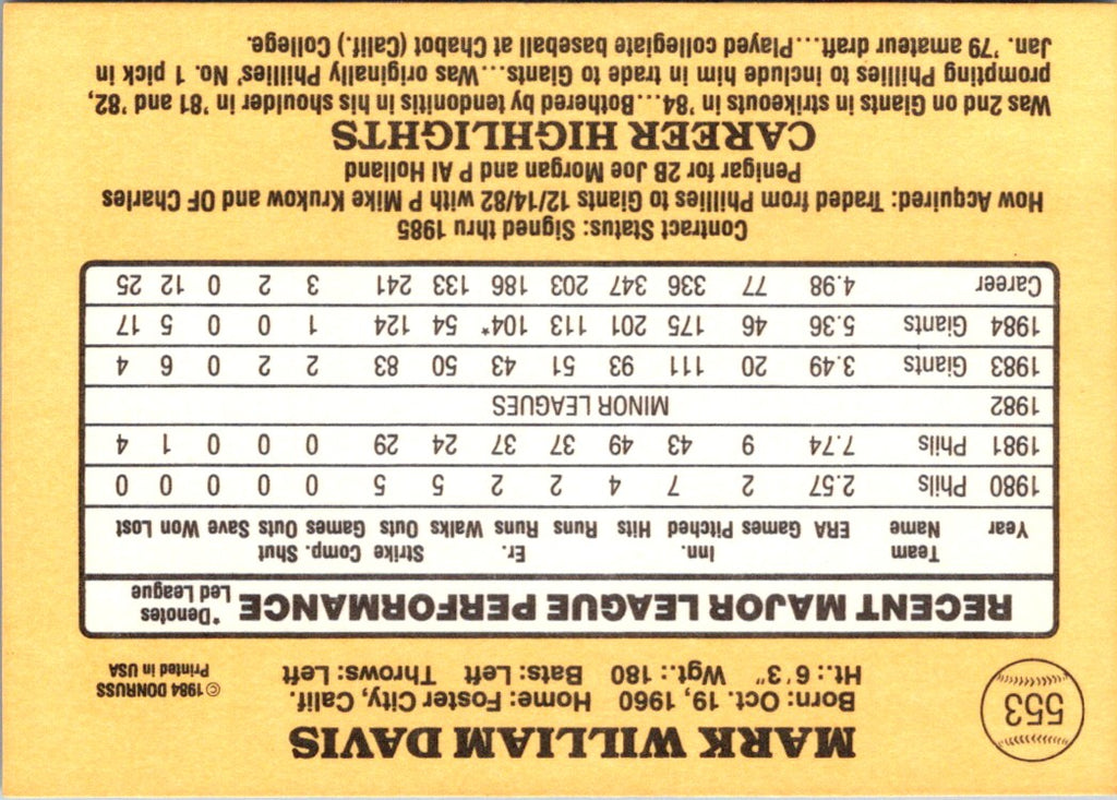 Description: 1985 Donruss Mark Davis #553
