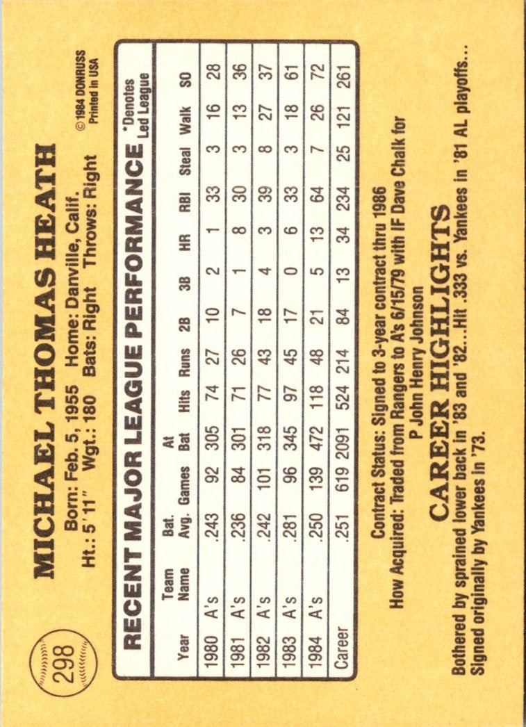 This 1985 Donruss Mike Heath card #298 is an essential piece for any Oakland Athletics fan! Featuring an iconic image of Mike Heath at bat, this card is an excellent addition to any A's collection. The card is in great condition, with sharp corners and bold colors. A must-have for any fan of the Athletics and Donruss!