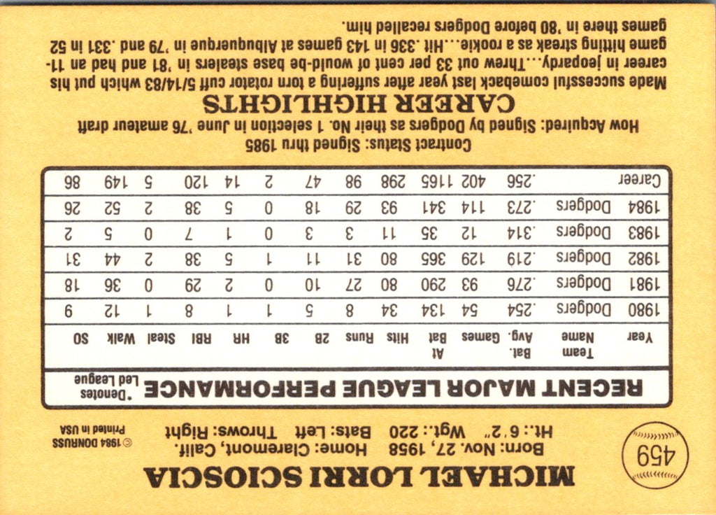 Description: 1985 Donruss Mike Scioscia #459
