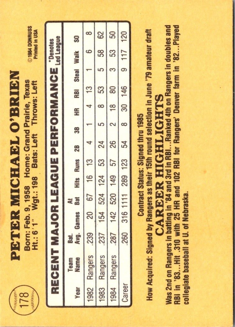 1985 Donruss Pete O'Brien #178 Texas Rangers is a must-have for any Rangers fan. Featuring a color image of the slugger mid-swing and the iconic Donruss design, this card is sure to be a conversation starter! The card is in near-mint condition, and its limited production and scarcity make it a great addition to any collection. Get your hands on this classic piece of memorabilia today and relive the glory days of the Texas Rangers!