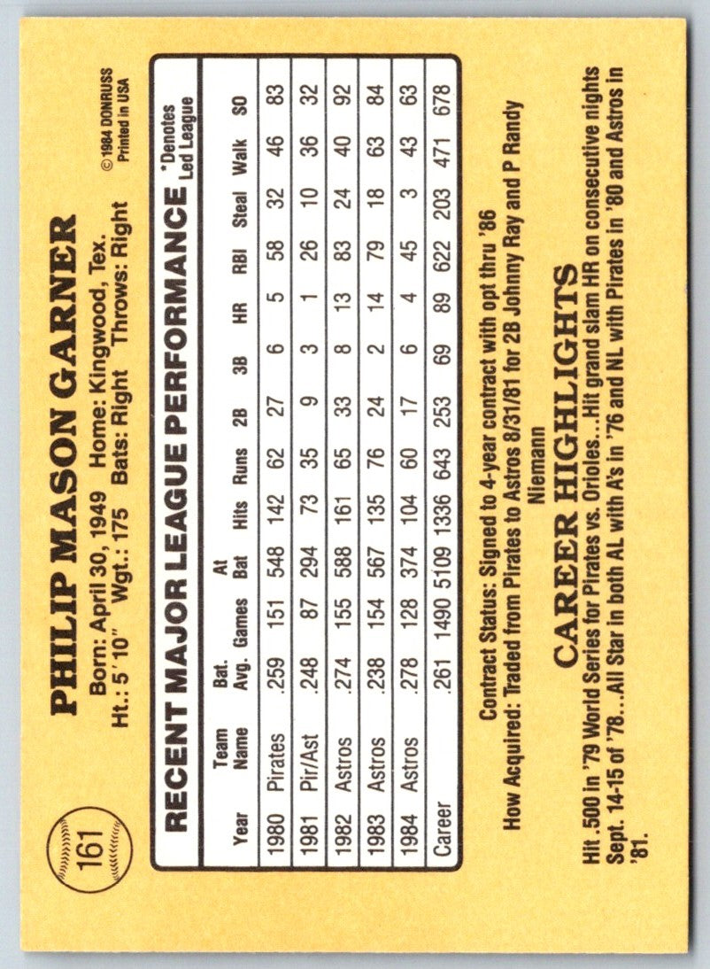 This 1985 Donruss Phil Garner card #161 is the perfect addition to your Houston Astros collection. Featuring a crisp image of the star infielder in a classic Astros uniform, this valuable card is sure to bring back memories of the 1985 season. Garner was an All-Star in 1985, hitting .264 with 14 home runs and 58 RBIs. His career spanned 16 seasons and included two world championships with the Astros in 2005 and 2017. Add this card to your collection today and celebrate one of the greatest players in franchise history!