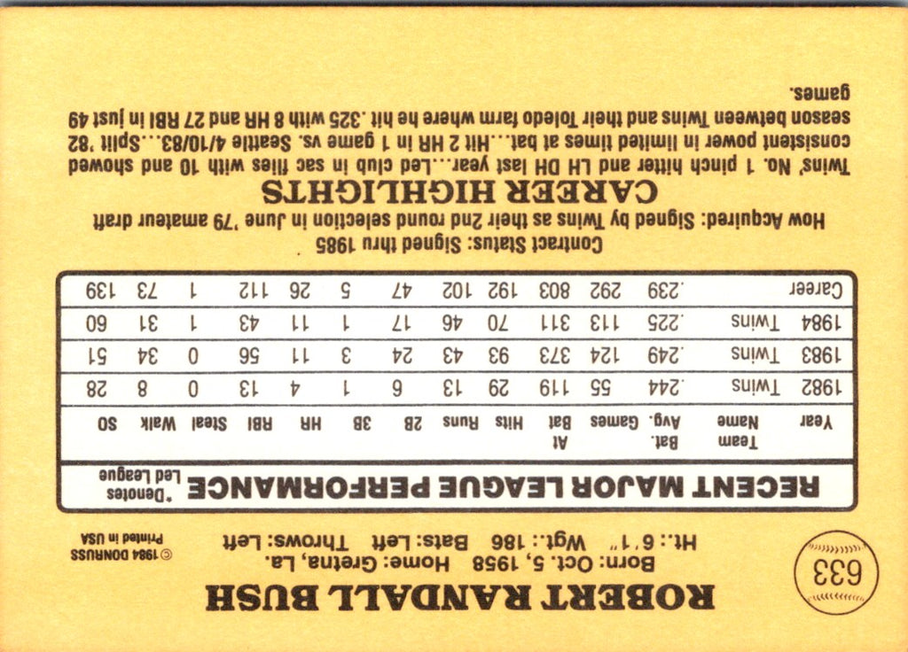 Description: 1985 Donruss Randy Bush #633