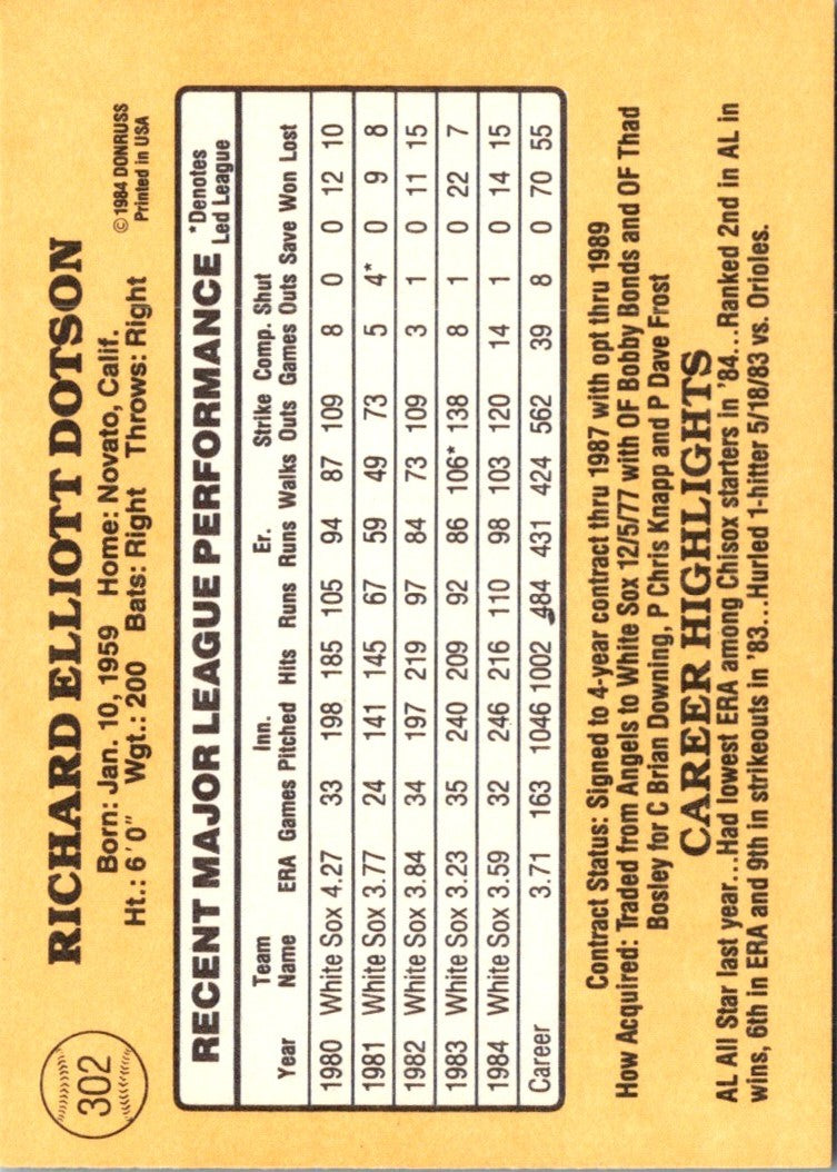 1985 Donruss Rich Dotson #302