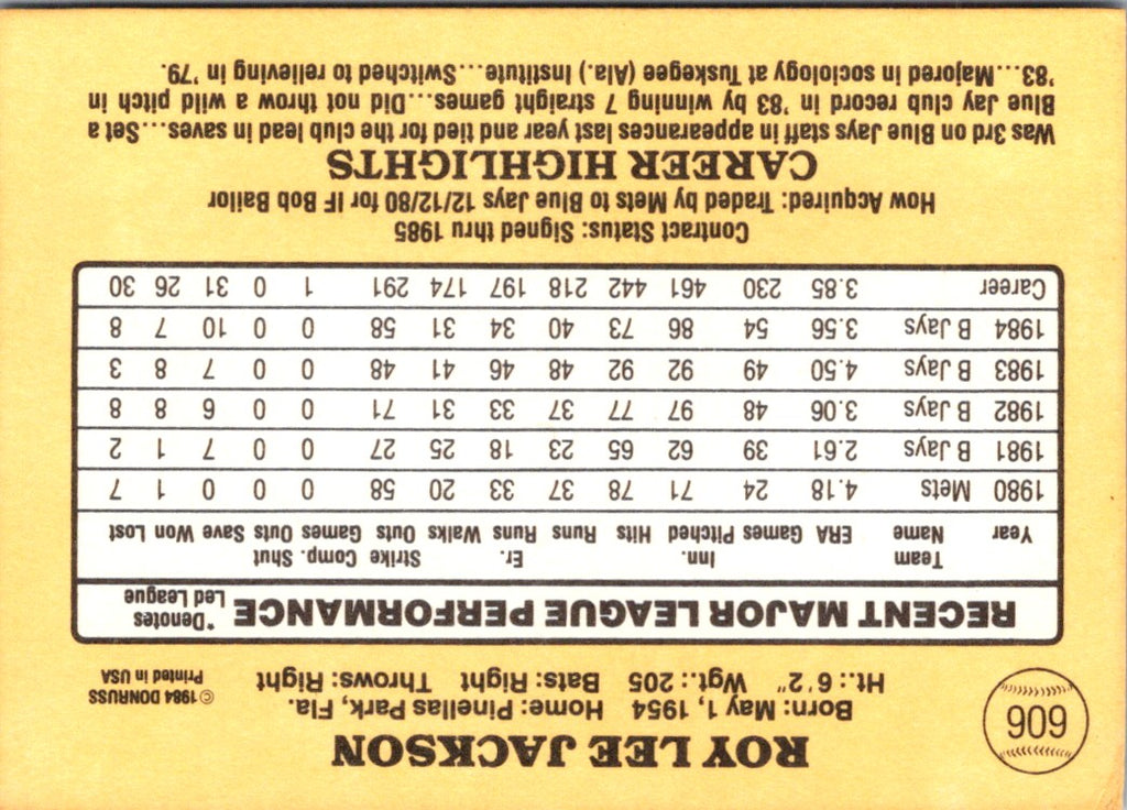 Description: 1985 Donruss Roy Lee Jackson #606