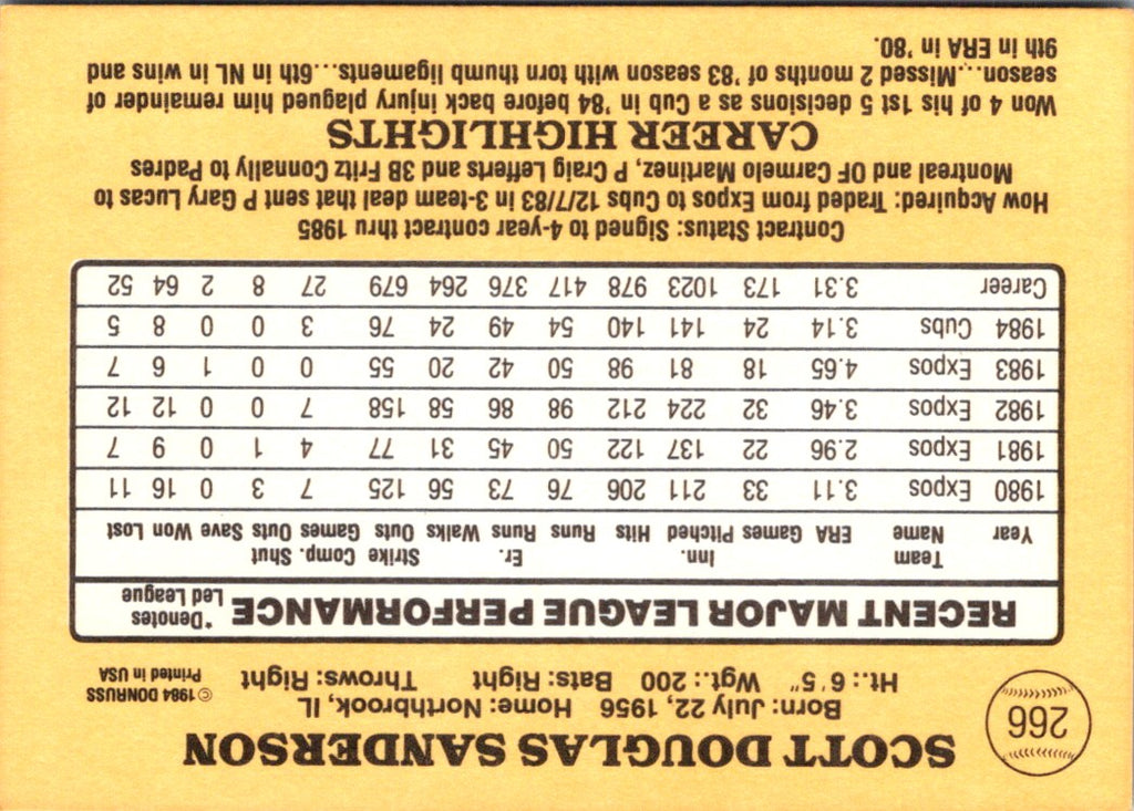 Description: 1985 Donruss Scott Sanderson #266
