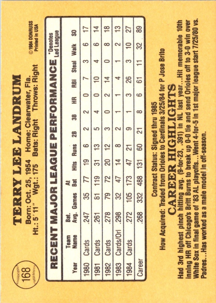 This 1985 Donruss Tito Landrum #168 St. Louis Cardinals card features a glossy finish and a full-color photo of the popular outfielder. Tito Landrum was a key member of the Cardinals' 1985 season, playing in over 100 games and helping the team to a second-place finish in the National League East. This card is a must for any Cardinals fan or collector, and a great way to commemorate Landrum's contributions to the team.
