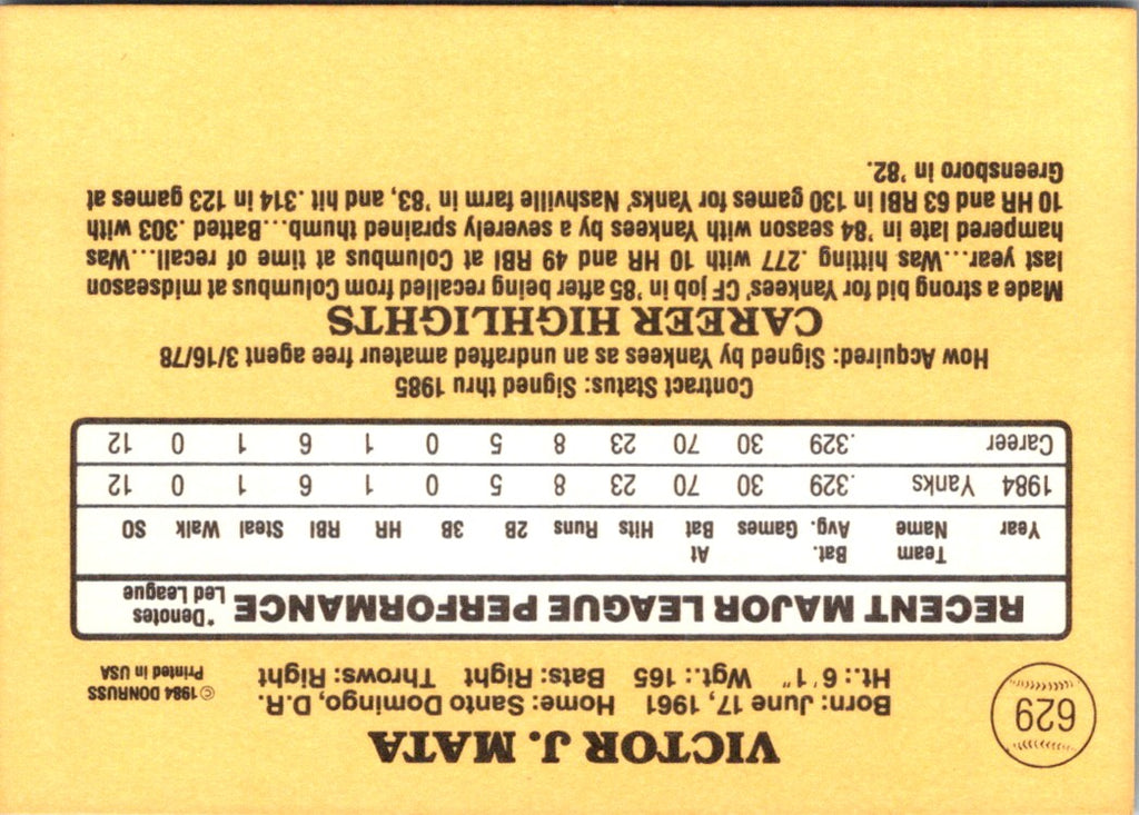 Description: 1985 Donruss Vic Mata #629 Rookie