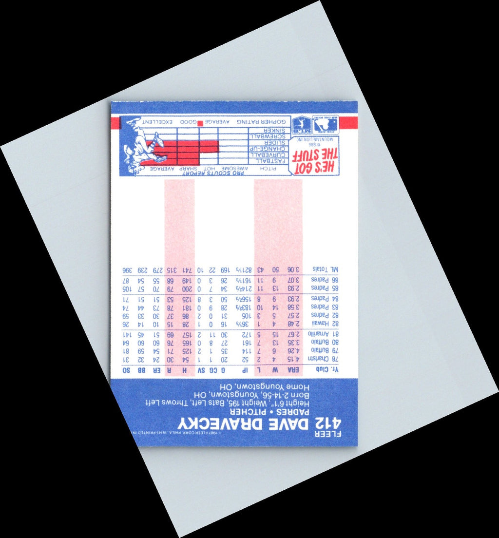 This 1985 Fleer Dave Dravecky #30 San Diego Padres card is a true collector's item. This card features a sharp, glossy image of the All-Star pitcher, showcasing his signature wind-up pitch. The back of the card features his stats, awards and a brief bio. Add this card to your collection and enjoy the memories of the greats of the game.