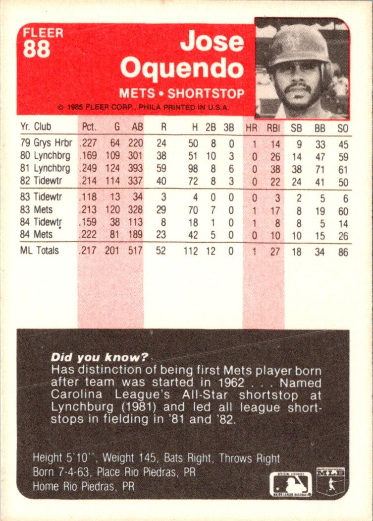 This 1985 Fleer Jose Oquendo #88 New York Mets card is perfect for any Mets fan or card collector. Featuring a crisp and clear picture of Oquendo in his Mets uniform, the card is sure to become a treasured part of any collection. The card is in excellent condition, with no visible wear or damage. This is a great opportunity to own a piece of Mets history, and show off your fandom to the world. Add this 1985 Fleer Jose Oquendo #88 New York Mets card to your collection today!