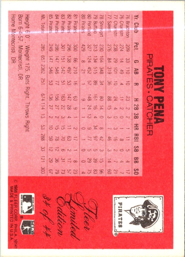 This 1985 Fleer Tony Pena #24 is an essential for any Pittsburgh Pirates collector. The card features a colorful, action-packed image of Pena in his Pirates uniform, complete with the iconic Pirate logo. Pena was an All-Star catcher who had a successful 11-year career in the MLB, and this card is a great way to commemorate his time in Pittsburgh. Add this card to your collection today and show your Pirates pride!