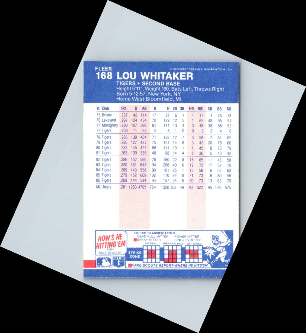 Lou Whitaker was one of the most reliable and consistent players of the 1980s. 1985 Fleer Lou Whitaker #24 showcases the Detroit Tigers' star second baseman in all his glory. This classic baseball card features Whitaker in his Tigers uniform, with a brilliant blue sky behind him. His bat is poised and ready to swing for the fences, just like he did in his 19-year career. This is a must-have for any Tigers fan or collector. Add it to your collection today and celebrate a true Detroit legend.