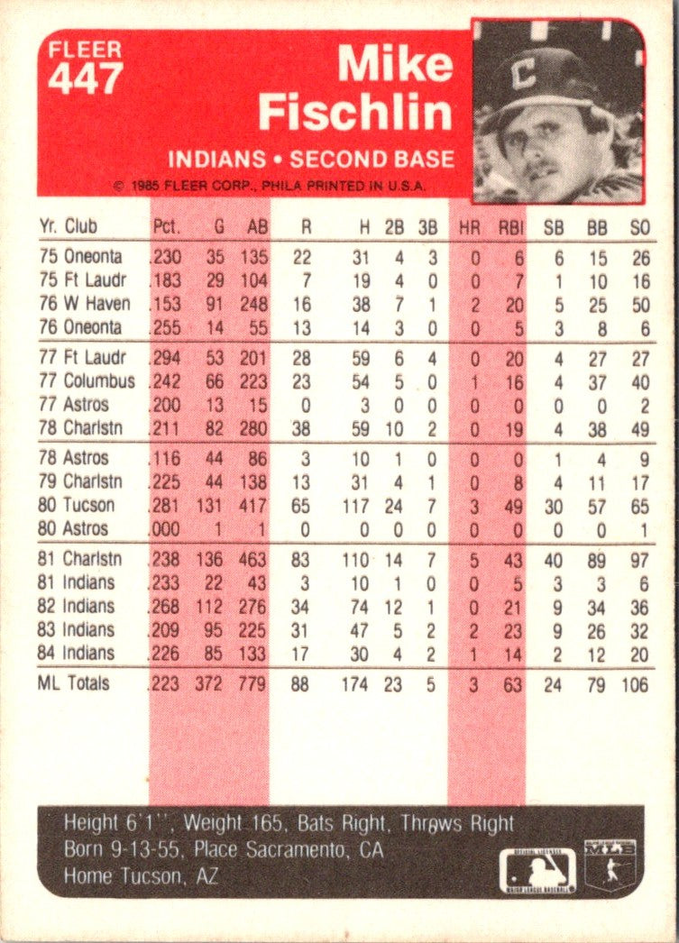 Introducing 1985 Fleer Mike Fischlin #447 Cleveland Indians! This iconic card features Fischlin in his classic Indians uniform, ready to take the field and make history. With great quality and detail, this card is a must-have for any fan of the Indians or of Fischlin himself. Celebrate the legendary career of one of the greatest players of all time with this timeless card. Add it to your collection today!