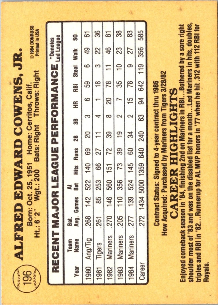 This 1985 Leaf Al Cowens #239 Seattle Mariners card is a must-have for any Mariners fan. Featuring a classic picture of Cowens in his Seattle Mariners uniform, this card is a great way to commemorate the career of one of the most beloved Mariners of all time. The glossy finish of the card adds an extra layer of quality and shows off the detailed artwork of the print. With a card like this at your disposal, you can relive the glory days of the Mariners and remember the impact Cowens had on the team. Get your hands on this classic 1985 Leaf Al Cowens #239 Seattle Mariners card today!