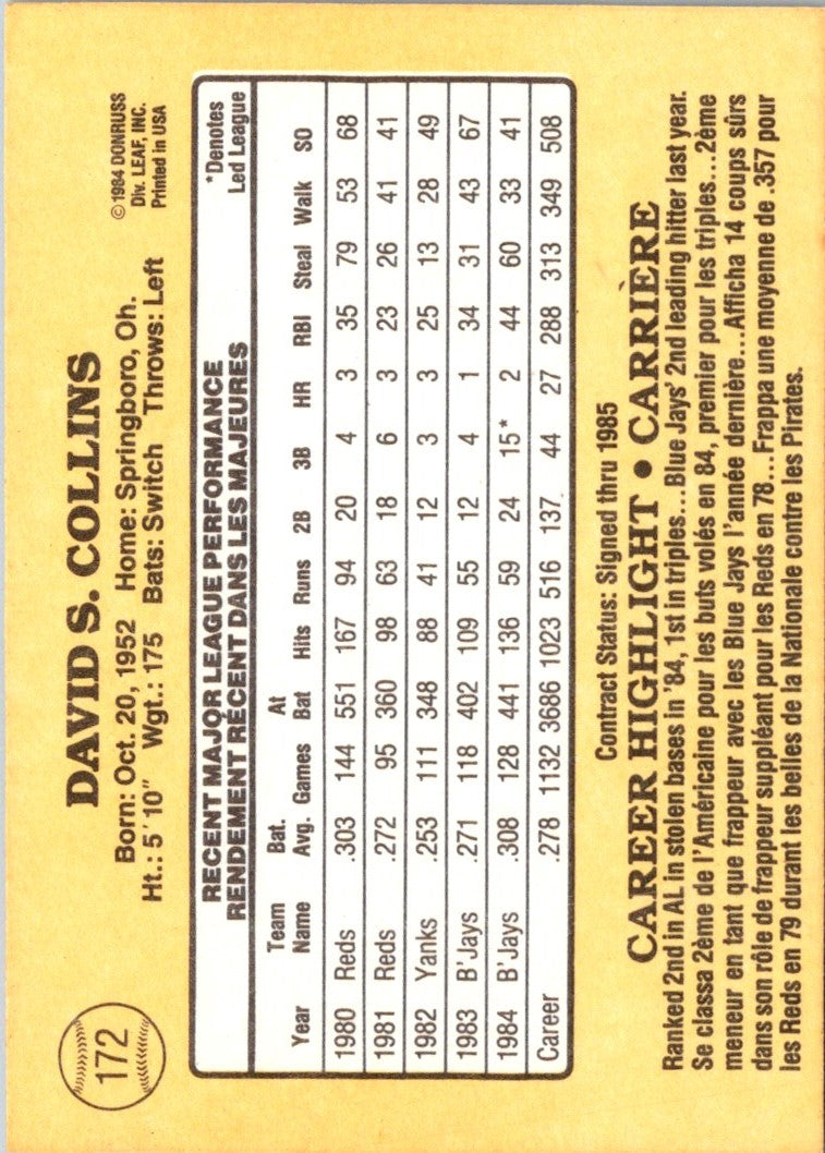 This 1985 Leaf Dave Collins #172 Toronto Blue Jays card is a valuable collectible for any fan. The card features a glossy full-color image of Dave Collins in his Blue Jays uniform, ready to take the field. It's the perfect addition to any fan's collection, and a great way to commemorate the 1985 season. With a great selection of stats on the back, you can keep track of Collins' performance that year. Whether you're a fan of the Blue Jays, or a fan of baseball cards, this is an absolute must-have for any collection.