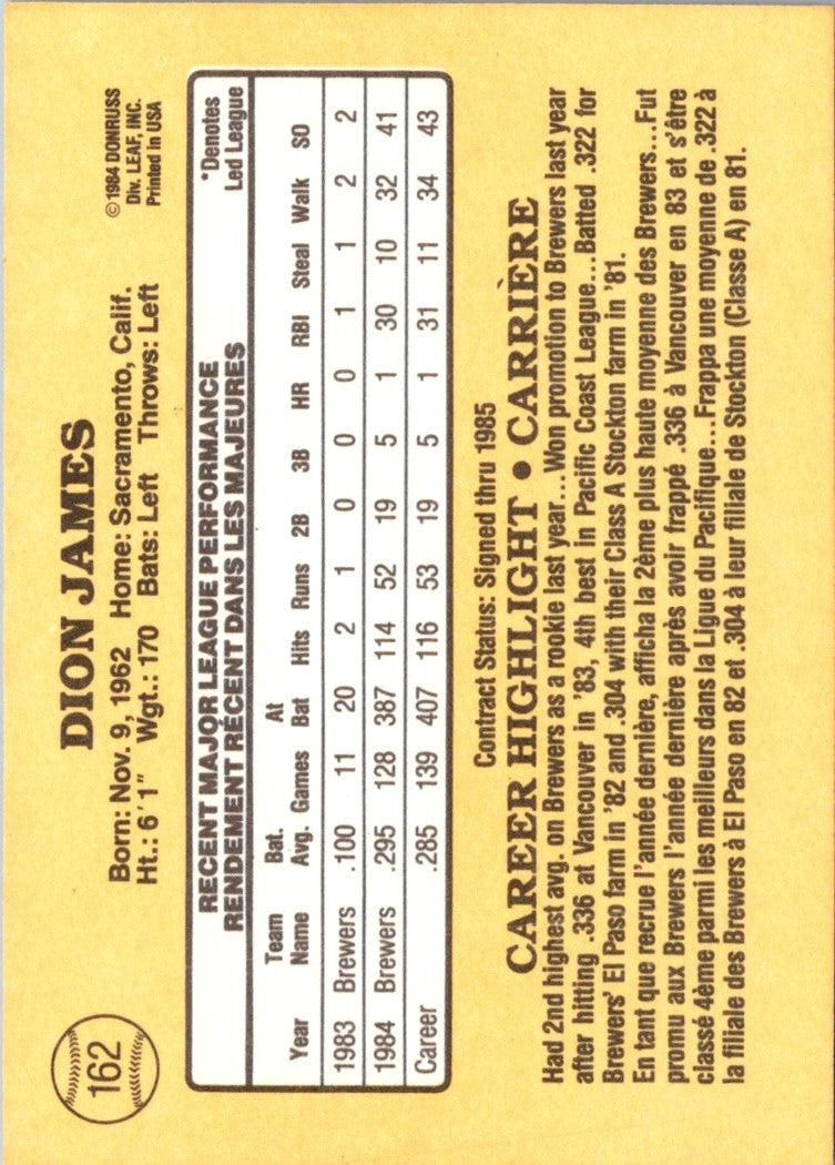 This 1985 Leaf Dion James #162 Milwaukee Brewers card is an essential addition to any collection. Featuring a vibrant photo of James in his Brewers uniform, it captures the outfielder in the midst of a powerful swing. The card also includes the player's career stats, making it a great way to honor his legacy. Get your hands on this classic collectible today and add a unique piece to your collection!