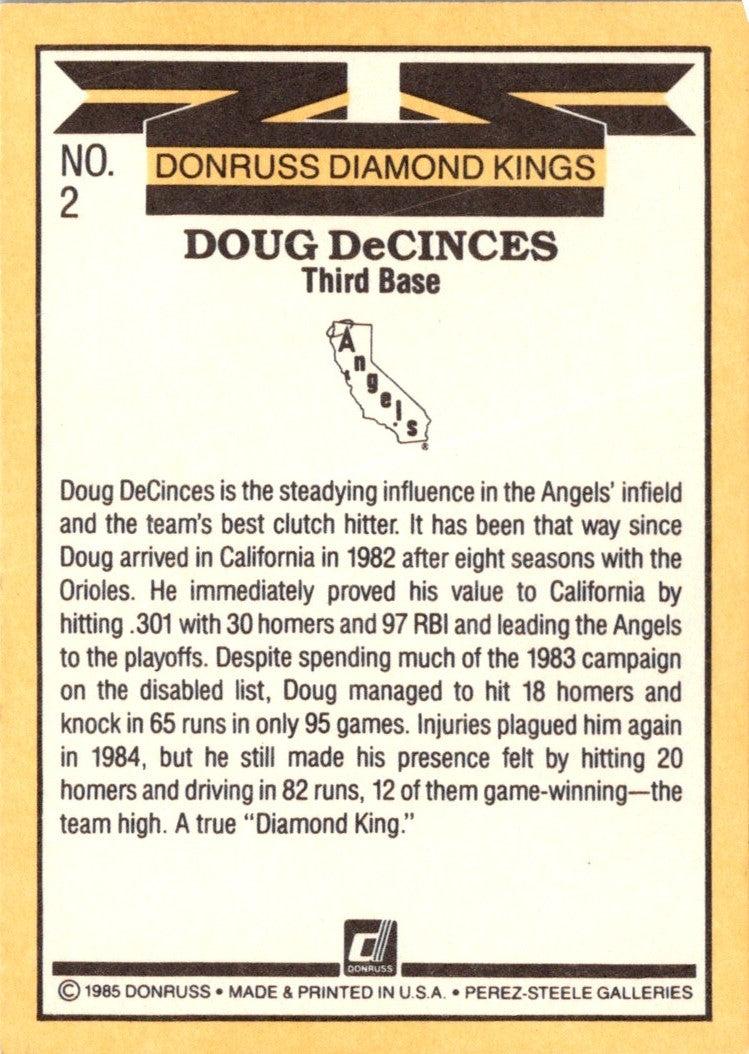This 1985 Leaf Doug DeCinces #2 card is an essential piece of memorabilia for any Angels fan. The card features a full-color action shot of DeCinces at the plate, showing off his powerful swing. The card’s reverse features detailed stats and career highlights, making this a must-have piece of Angels history. Add this card to your collection today and celebrate one of the greatest players in California Angels history.