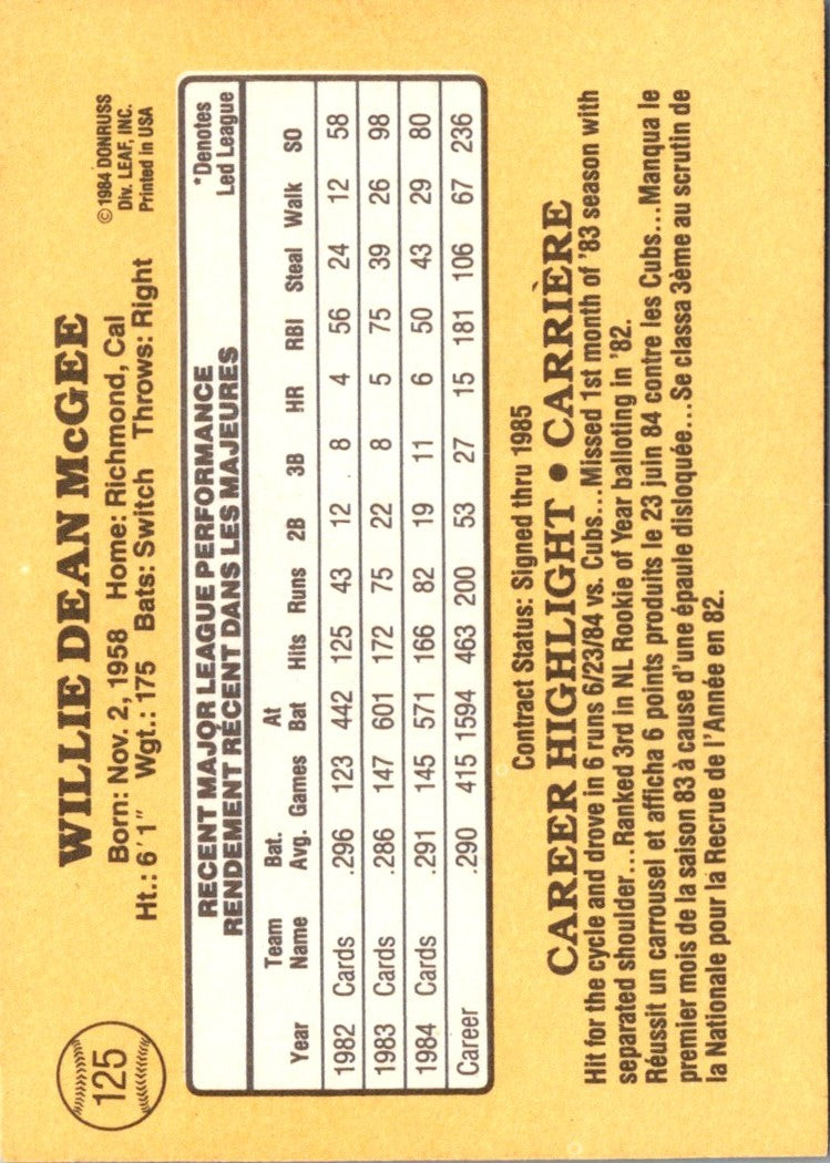 This 1985 Leaf Willie McGee #125 St. Louis Cardinals card is a must-have for any baseball card collector. Featuring the outfielder in his signature batting stance, this card captures McGee's grace and power in the batter's box. With sharp corners and vivid colors, this card is sure to stand out in any collection. Add this card to your collection today and bring home a piece of Cardinals history.